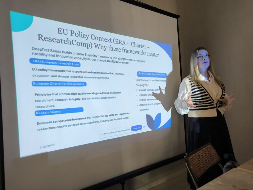 Στη συνέχεια της συνάντησης, οι εκπρόσωποι του τεχνικού συμβούλου του Περιφερειακού Ταμείου Ανάπτυξης Κεντρικής Μακεδονίας παρουσίασαν τη μεθοδολογία που εφαρμόζεται στο έργο DeepTechValleys σχετικά με την αναζήτηση, την ανάλυση και την τεκμηρίωση καλών πρακτικών από άλλες ευρωπαϊκές περιφέρειες, καθώς και τον τρόπο αξιολόγησης της δυνατότητας εφαρμογής τους στην Κεντρική Μακεδονία. Παράλληλα, παρουσιάστηκε η εξερεύνηση πιθανών πιλοτικών δράσεων που, σε συνδυασμό με τα υφιστάμενα και τα νέα εργαλεία πολιτικής, μπορούν να ενισχύσουν ουσιαστικά τις περιφερειακές παρεμβάσεις για την προώθηση της deep tech καινοτομίας.
