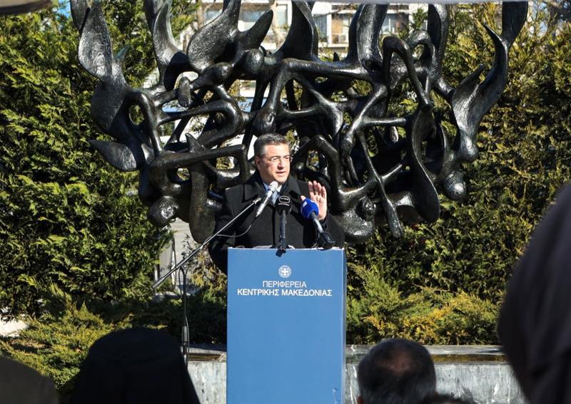 Ο Περιφερειάρχης στην κεντρική παρέμβασή του επισήμανε: «Η καθιέρωση της Ημέρας Μνήμης για τους Έλληνες Εβραίους Μάρτυρες και Ήρωες του Ολοκαυτώματος, είναι μια ιδιαίτερα σημαντική, εθνική απόφαση αυτογνωσίας. Ειδικά εδώ στη Θεσσαλονίκη, είναι μια Ημέρα που μας κάνει να σκεφτόμαστε ένα από τα σκοτεινότερα κεφάλαια της νεότερης Ιστορίας μας. Μνήμες πόνου και απώλειας που δεν χωρούν στον ανθρώπινο νου. Γιατί καμία άλλη εβραϊκή κοινότητα στην Ευρώπη δεν εξοντώθηκε τόσο μαζικά τόσο γρήγορα, όσο η εβραϊκή κοινότητα της Θεσσαλονίκης. Μια κοινότητα, από τις μεγαλύτερες και αρχαιότερες στην Ευρώπη και επίκεντρο του Σεφαραδίτικου Εβραϊσμού, που ήταν άρρηκτα συνδεδεμένη με την ιστορία και την πορεία της πόλης. Λίγα μέτρα από αυτήν εδώ την Πλατεία, ξεκίνησε το πρώτο ‘τρένο του θανάτου’ για το Άουσβιτς – Μπίρκεναου, στοιβαγμένο με παιδιά, γυναίκες, άνδρες και ηλικιωμένους, που έβλεπαν για τελευταία φορά την αγαπημένη τους πατρίδα. Το Μνημείο του Ολοκαυτώματος μάς προτρέπει να κοιτάξουμε κατάματα αυτό το παρελθόν. Και ταυτόχρονα αποτελεί τη διαρκή υπενθύμιση του καθήκοντος που έχουμε: Να μην αφήσουμε ποτέ, ούτε χαραμάδα στο τυφλό μίσος, το ρατσισμό και τον αντισημιτισμό. Να μεταδώσουμε στις νέες γενιές το μήνυμα, ότι το μίσος, ο ρατσισμός και η βία δεν μπορούν και δεν πρέπει να γίνουν ούτε ανεκτά, ούτε αποδεκτά στις δημοκρατικές κοινωνίες. Να αποκρούσουμε κάθε φωνή μίσους. Να αντιμετωπίσουμε αποφασιστικά το νεοναζισμό και τη μισαλλοδοξία, που εμφανίζονται και πάλι στην Ευρώπη σήμερα. Να ξεριζώσουμε τις ασυνάρτητες θεωρίες συνωμοσίας. Γιατί τα ιστορικά γεγονότα δεν μπορούν να διαγραφούν. Και η ιστορική πραγματικότητα δεν μπορεί να αλλοιωθεί».