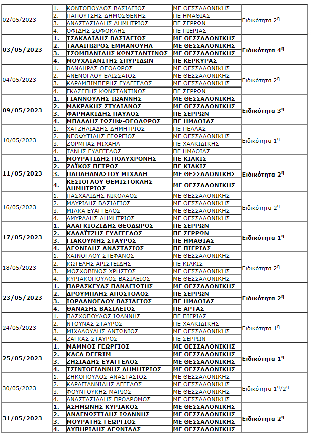 Από την Δ/νση Περιβάλλοντος, Βιομηχανίας, Ενέργειας & Φυσικών Πόρων (ΠΚΜ) της Γενικής Διεύθυνσης Ανάπτυξης και Περιβάλλοντος / Π.Κ.Μ ανακοινώνεται ότι στις εξετάσεις της δραστηριότητας των Χειριστών Μηχανημάτων Έργου που θα πραγματοποιηθούν στις 2,3,4,9,10,11,16,17,18,23,24,25,30,31/05/2023, θα συμμετέχουν οι παρακάτω υποψήφιοι: