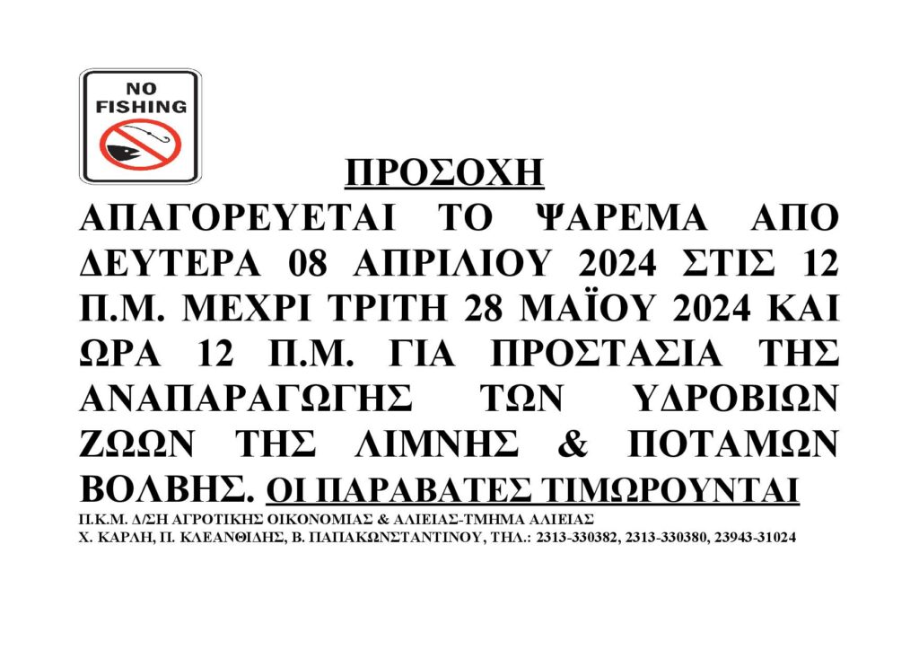 Ανακοίνωση σχετικά με την απαγόρευση ενάσκησης επαγγελματικής και ερασιτεχνικής αλιείας στη λίμνη Βόλβη, στον Ρήχιο ποταμό και σε όλα τα ρέοντα ύδατα, ρυάκια, ποτάμια, χειμάρρους, που καταλήγουν άμεσα στη λίμνη και σε απόσταση 3.000 μέτρων από το σημείο εκβολής τους στη λίμνη
