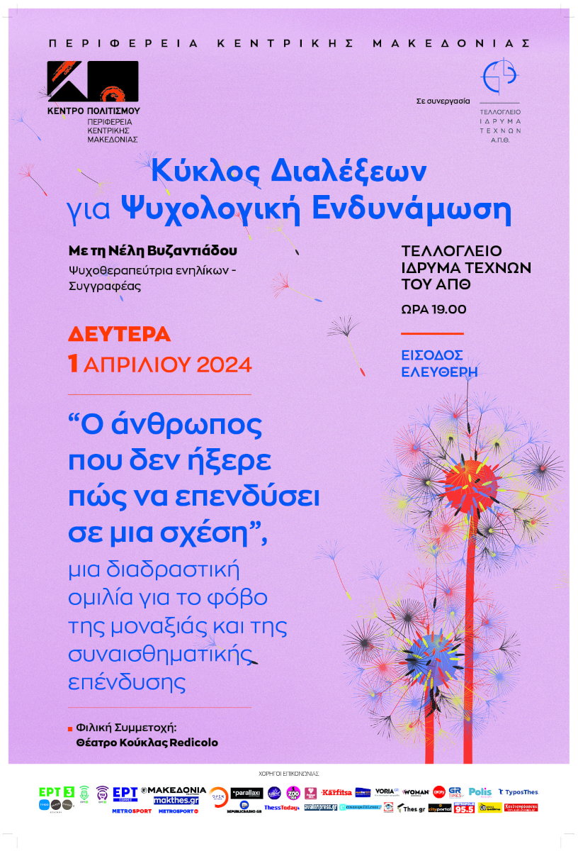 Το Κέντρο Πολιτισμού της Περιφέρειας Κεντρικής Μακεδονίας σε συνεργασία με την Αντιδημαρχία Πολιτισμού του Δήμου Κορδελιού – Ευόσμου διοργανώνει «Κύκλο Ομιλιών για Ψυχολογική Ενδυνάμωση» Με τη Νέλη Βυζαντιάδου Ψυχοθεραπεύτρια – Συγγραφέας στο Θέατρο «ΜΙΚΗΣ ΘΕΟΔΩΡΑΚΗΣ» (Πολυλειτουργικό Κέντρο Δήμου Κορδελιού Ευόσμου, Παρατσίκογλου 1, Ελευθέριο-Κορδελιό (είσοδος από οδό Μοναστηρίου) 13/3 & 27/3 στις 18:00 ΜΕ ΕΛΕΥΘΕΡΗ ΕΙΣΟΔΟ ΓΙΑ ΤΟ ΚΟΙΝΟ […]