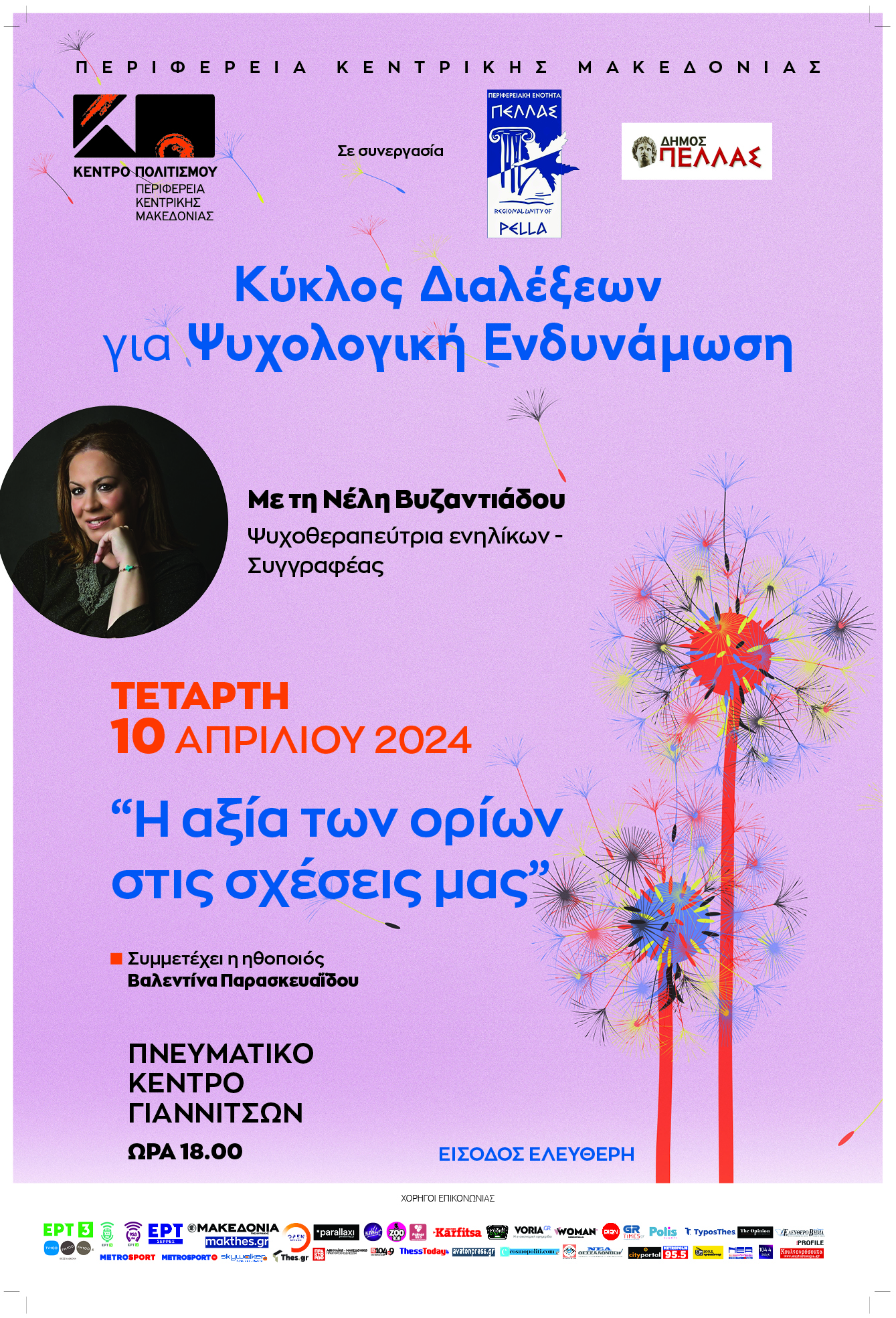 Το Κέντρο Πολιτισμού της Περιφέρειας Κεντρικής Μακεδονίας διοργανώνει «Ομιλία για Ψυχολογική Ενδυνάμωση» Με τη Νέλη Βυζαντιάδου (Ψυχοθεραπεύτρια – Συγγραφέας) Τετάρτη 10 Μαΐου 2023 ΠΛΑΓΙΑΡΙ Κέντρο Πολιτισμού Πλαγιαρίου στις 18:00 & ΚΑΡΔΙΑ Αίθουσα Εκδηλώσεων του Ι.Ν Γεννήσεως της Θεοτόκου Καρδίας στις 20:00 ΜΕ ΕΛΕΥΘΕΡΗ ΕΙΣΟΔΟ ΓΙΑ ΤΟ ΚΟΙΝΟ Θέμα : «Τα καλά όρια κάνουν τους καλούς γείτονες» Μια ομιλία που αναδεικνύει τη […]