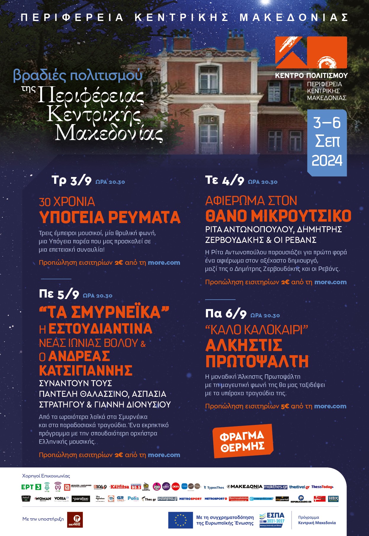 ΒΡΑΔΙΕΣ ΠΟΛΙΤΙΣΜΟΥ ΣΤΗ ΒΙΛΑ ΑΛΛΑΤΙΝΗ 26-28 Μαΐου 2023 Το Κέντρο Πολιτισμού της Περιφέρειας Κεντρικής Μακεδονίας διοργανώνει για τέταρτη συνεχή χρονιά τις «Βραδιές πολιτισμού στη Βίλα Αλλατίνη», τον νέο πολιτιστικό θεσμό που αξιοποιεί και αναδεικνύει τους πανέμορφους κήπους και το επιβλητικό κτίριο με την μεγάλη ιστορία, στην συνοικία των Εξοχών. 1200 αριθμημένα καθίσματα θα υποδεχθούν το κοινό μας, ενώ για […]