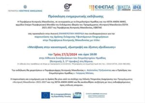 H Περιφέρεια Κεντρικής Μακεδονίας, σε συνεργασία με το Επιμελητήριο Ημαθίας και την ΚΕΠΑ-ΑΝΕΜ ΑΜΚΕ, αρμόδια Εταίρο-Περιφερειακή Μονάδα του Ενδιάμεσου Φορέα του Προγράμματος «Κεντρική Μακεδονία»/ΕΣΠΑ 2021-2027 της Περιφέρειας Κεντρικής Μακεδονίας, ΕΦΕΠΑΕ σας προσκαλούν στην Ανοικτή ΕΝΗΜΕΡΩΤΙΚΗ ΗΜΕΡΙΔΑ που συνδιοργανώνουν για την παρουσίαση της Δράσης Ενίσχυσης Υφιστάμενων Επιχειρήσεων στην Περιφέρεια Κεντρικής Μακεδονίας με τίτλο: