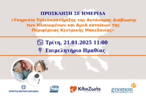 Από τη Δ/νση Δημόσιας Υγείας και Κοινωνικής Μέριμνας – Τμήμα Κοινωνικής Μέριμνας της Περιφερειακής Ενότητας Ημαθίας σας προσκαλούμε την Τρίτη, 21.01.2025 και η ώρα 11:00, στην αίθουσα εκδηλώσεων του Επιμελητηρίου Ημαθίας στην ημερίδα παρουσίασης της καινοτόμου υπηρεσίας τηλεϋποστήριξης «Κλικ Ζωής» της Περιφέρειας Κεντρικής Μακεδονίας.