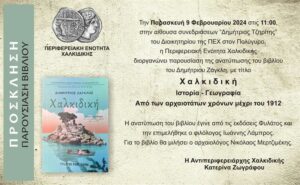 Την Παρασκευή 9 Φεβρουαρίου 2024 στις 11:00, στην αίθουσα συνεδριάσεων “Δημήτριος Τζηρίτης” του Διοικητηρίου της ΠΕΧ στον Πολύγυρο, η Περιφερειακή Ενότητα Χαλκιδικής διοργανώνει παρουσίαση της ανατύπωσης του βιβλίου του Δημήτριου Ζάγκλη, με τίτλο: