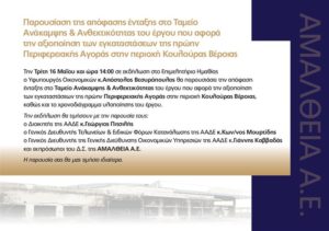 Πρόσκληση σε παρουσίαση απόφασης ένταξης στο Ταμείο Ανάκαμψης & Ανθεκτικότητας του έργου που αφορά την αξιοποίηση των εγκαταστάσεων της πρώην Περιφερειακής Αγοράς στην περιοχή Κουλούρας Βέροιας (15/5/2023)