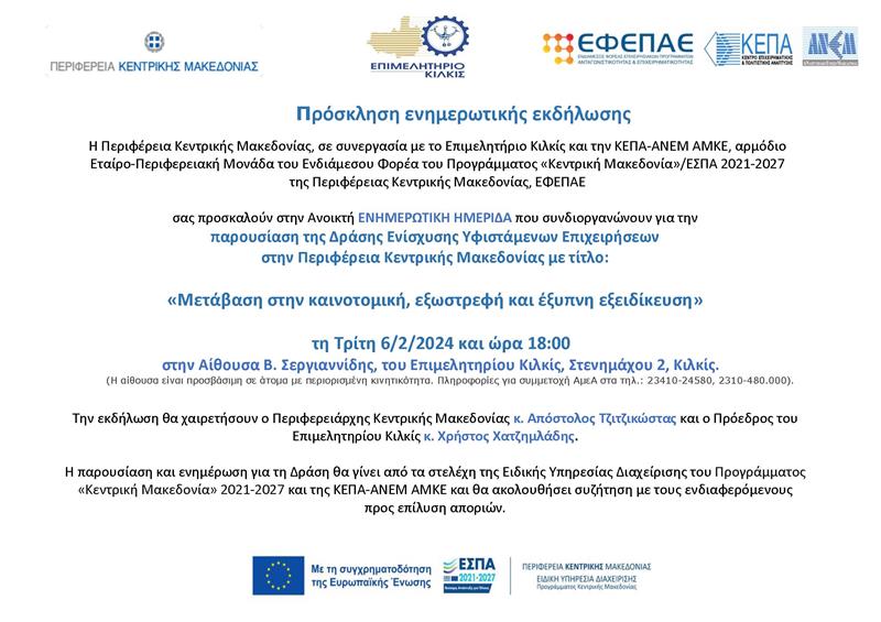 H Περιφέρεια Κεντρικής Μακεδονίας, σε συνεργασία με το Επιμελητήριο Κιλκίς και την ΚΕΠΑ-ΑΝΕΜ ΑΜΚΕ, αρμόδιο Εταίρο-Περιφερειακή Μονάδα του Ενδιάμεσου Φορέα του Προγράμματος «Κεντρική Μακεδονία»/ΕΣΠΑ 2021-2027 της Περιφέρειας Κεντρικής Μακεδονίας, ΕΦΕΠΑΕ συνδιοργανώνουν Ανοικτή Ενημερωτική Εκδήλωση παρουσίασης της Δράσης Ενίσχυσης Υφιστάμενων Επιχειρήσεων στην Περιφέρεια Κεντρικής Μακεδονίας με τίτλο: «Μετάβαση στην καινοτομική, εξωστρεφή και έξυπνη εξειδίκευση» την Τρίτη 6/2/2024 και ώρα 18:00 στην Αίθουσα Βασίλης Σεργαννίδης του Επιμελητηρίου Κιλκίς (Στενημάχου 2, Κιλκίς). (Η αίθουσα είναι προσβάσιμη σε άτομα με περιορισμένη κινητικότητα. Πληροφορίες για συμμετοχή ΑμεΑ στα τηλ.: 23410-24580, 2310-480.000).