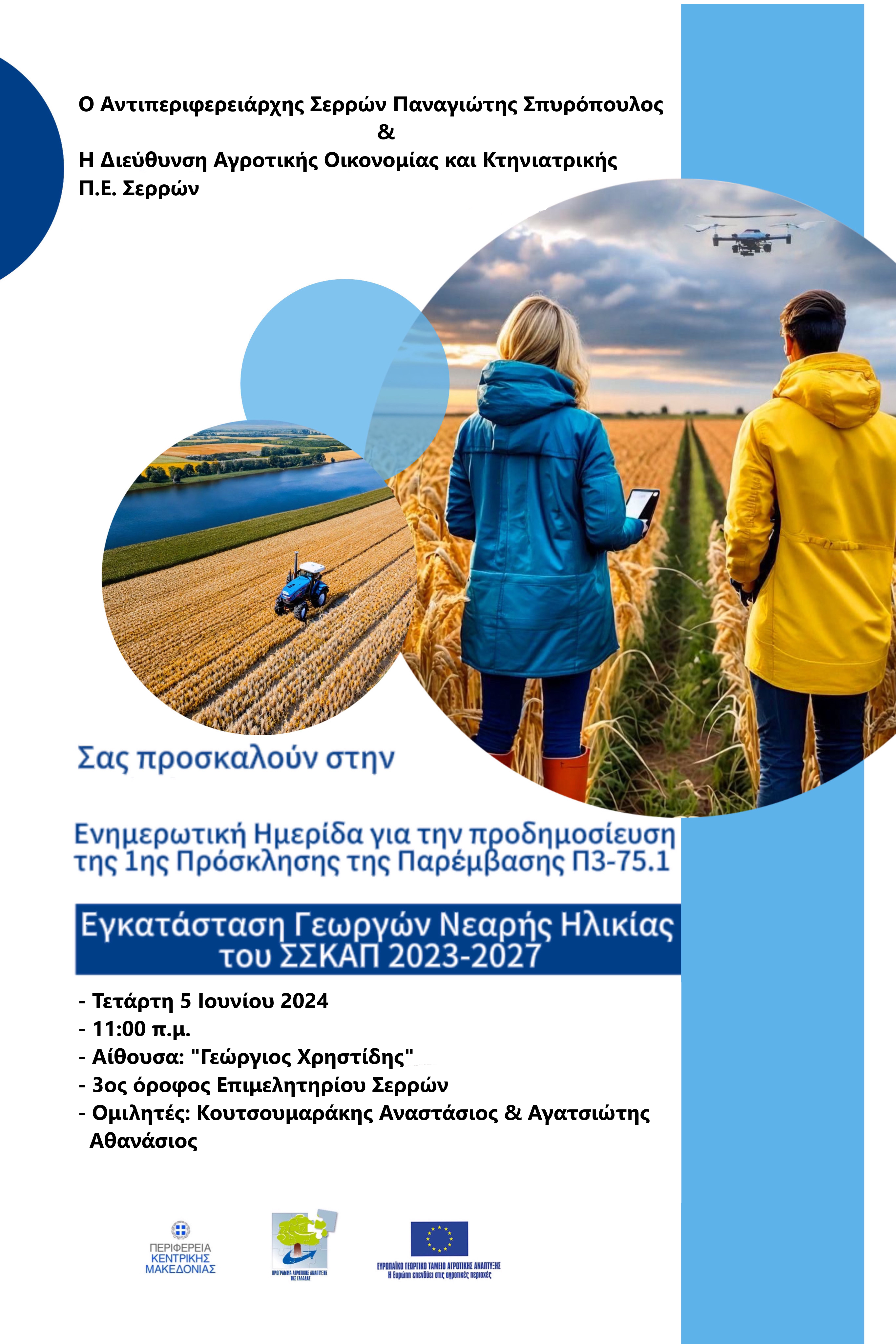 ΕΝΗΜΕΡΩΤΙΚΗ ΗΜΕΡΙΔΑ ΓΙΑ ΤΗ ΠΡΟΔΗΜΟΣΙΕΥΣΗ 1ης ΠΡΟΣΚΛΗΣΗΣ «Εγκατάσταση Γεωργών Νεαρής Ηλικίας» ΣΤΙΣ ΣΕΡΡΕΣ ΣΤΙΣ 5-6-2024