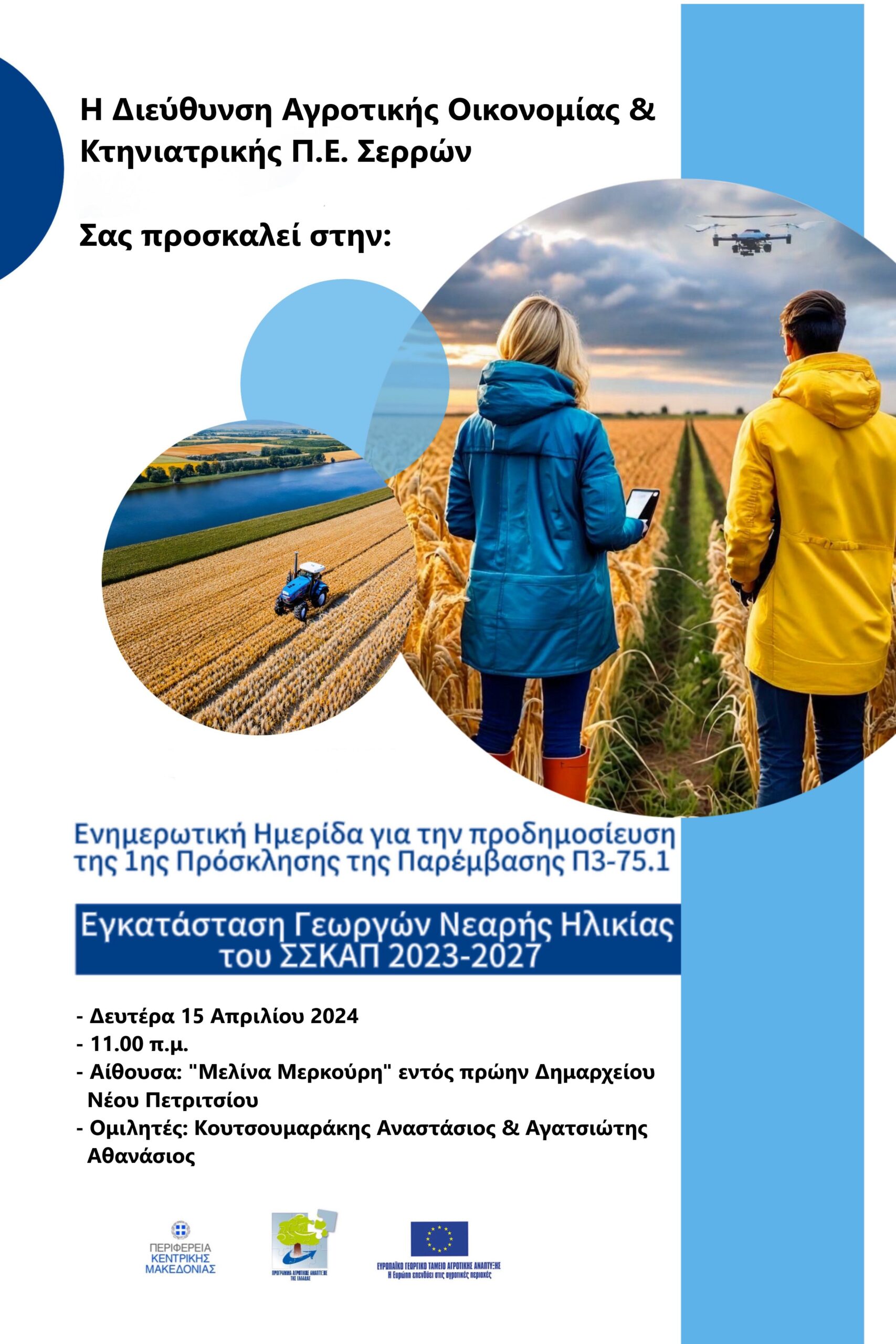 Η Διεύθυνση Αγροτικής Οικονομίας και Κτηνιατρικής Π.Ε. Σερρών διοργανώνει και σας προσκαλεί στην Ενημερωτική Ημερίδα για την Προδημοσίευση της 1ης Πρόσκλησης της Παρέμβασης Π3-75.1 «Εγκατάσταση Γεωργών Νεαρής Ηλικίας του ΣΣΚΑΠ 2023-2027».