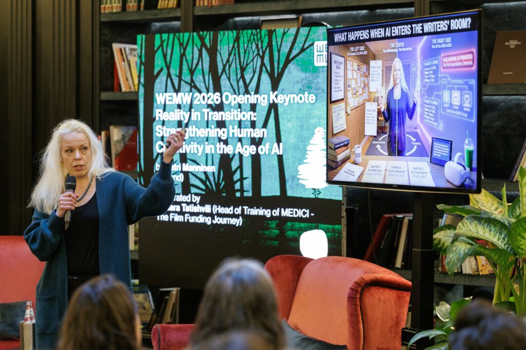 Στη φετινή διοργάνωση του When East Meets West κυριάρχησε το θέμα της τεχνητής νοημοσύνης (ΑΙ) και των αναπόφευκτων αλλαγών στη διαμόρφωση της πραγματικότητας μέσα από τον κινηματογράφο (“Reality in transition”), που επηρεάζουν όλο το φάσμα της οπτικοακουστικής παραγωγής, δημιουργώντας νέες δυνατότητες, αλλά και προκλήσεις για τους επαγγελματίες και τους οργανισμούς. Σε αυτό το πλαίσιο, η κεντρική εκδήλωση της διοργάνωσης, με τίτλο «Η πραγματικότητα σε μετάβαση: Ενισχύοντας την ανθρώπινη δημιουργικότητα στην εποχή της τεχνητής νοημοσύνης», με ομιλήτρια τη Φινλανδή σεναριογράφο Katri Manninen, παρουσίασε το πώς η τεχνητή νοημοσύνη αναδιαμορφώνει τις πολιτιστικές και δημιουργικές βιομηχανίες και τις επαγγελματικές δεξιότητες, αμφισβητώντας την ιδέα ότι η τεχνολογία αποτελεί μια αυτόνομη λύση απέναντι στην αβεβαιότητα που αντιμετωπίζει ο οπτικοακουστικός κλάδος.