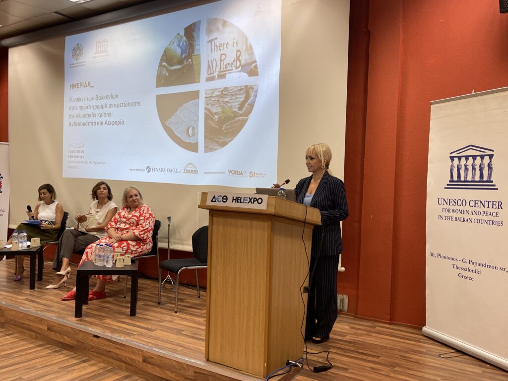 Θέμα της ημερίδας αποτέλεσαν οι “Γυναίκες των Βαλκανίων στην πρώτη γραμμή αντιμετώπισης της κλιματικής κρίσης: Ανθεκτικότητα και Αειφορία”. Η κα Μαυρίδου, αφού ευχαρίστησε την Πρόεδρο του Κέντρου UNESCO για τις Γυναίκες και την Ειρήνη στα Βαλκάνια  και της Εταιρείας Διαβαλκανικής Συνεργασίας Γυναικών, κα Καίτη Τζιτζικώστα, για την τιμητική πρόσκληση να συμμετέχει σε αυτήν την εκδήλωση όπως επίσης την κα Εύη Δοσίου – Κωνσταντοπούλου και τη συντονίστρια της εκδήλωσης, Δρ. Βαλασία Ιακωβόγλου, καθώς και τα μέλη του Δ.Σ., αναφέρθηκε στη διατήρηση του Ολύμπου ως πράσινου προορισμού και στο ρόλο των γυναικών στη γυναικεία πράσινη επιχειρηματικότητα. Επιπλέον, η Αντιπεριφερειάρχης Πιερίας, υπογράμμισε τη σημασία της προστασίας φυσικών πόρων, όπως ο Όλυμπος, και την προώθηση του αγροτουρισμού ως μέσο βιώσιμης ανάπτυξης, επισημαίνοντας πως οι γυναίκες παίζουν καθοριστικό ρόλο σε αυτές τις δραστηριότητες, συνδυάζοντας την προστασία του περιβάλλοντος με την ενίσχυση των τοπικών οικονομιών.