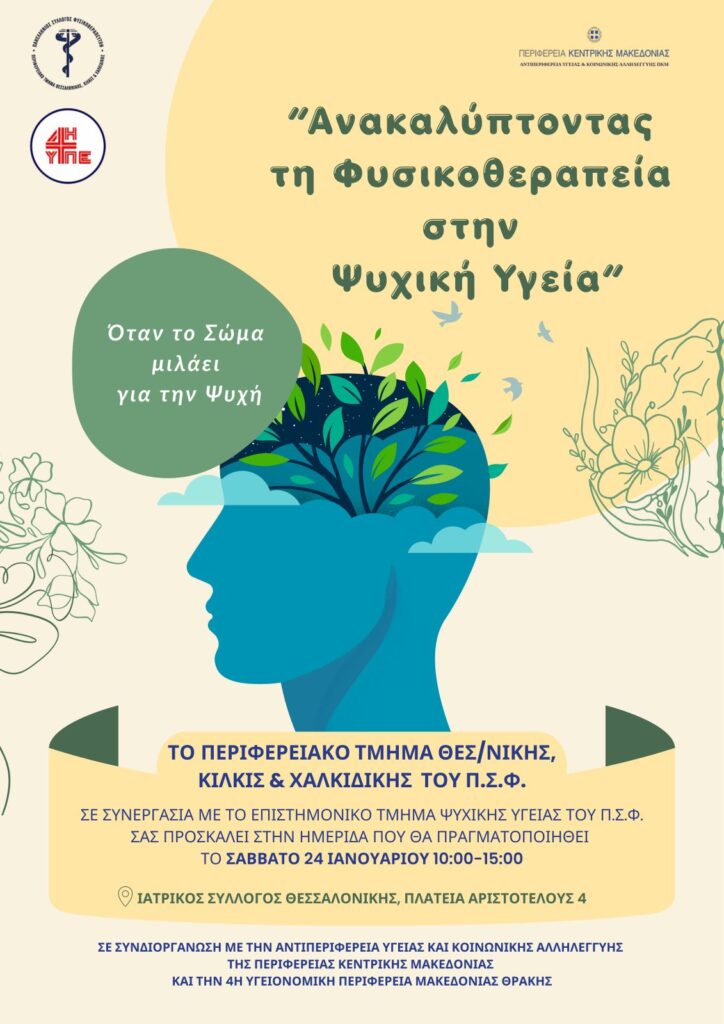 Ημερίδα με θέμα «Όταν το σώμα μιλάει για την ψυχή – Ανακαλύπτοντας τη φυσικοθεραπεία στην ψυχική υγεία» διοργανώνει η Αντιπεριφέρεια Υγείας και Κοινωνικής Αλληλεγγύης της Περιφέρειας Κεντρικής Μακεδονίας σε συνεργασία με το Περιφερειακό Τμήμα Θεσσαλονίκης, Κιλκίς και Χαλκιδικής του Πανελλήνιου Συλλόγου Φυσικοθεραπευτών, το Επιστημονικό Τμήμα Ψυχικής Υγείας του ΠΣΦ και την 4η Υγειονομική Περιφέρεια Μακεδονίας – Θράκης.