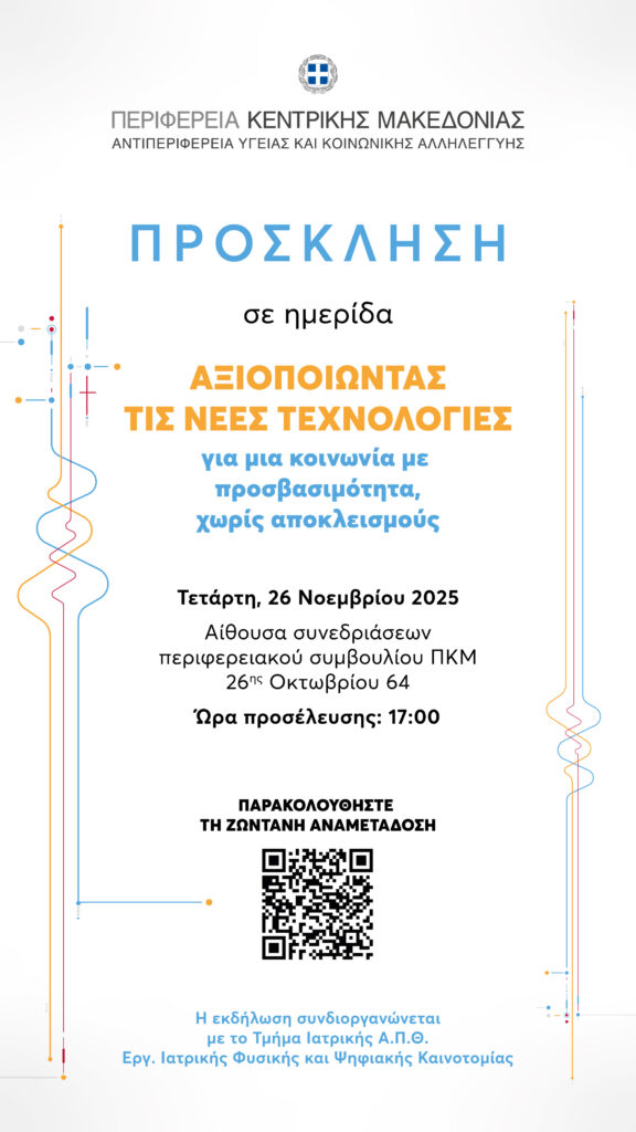 Ημερίδα με θέμα «Αξιοποιώντας τις νέες τεχνολογίες για μια κοινωνία με προσβασιμότητα, χωρίς αποκλεισμούς» διοργανώνει η Αντιπεριφέρεια Υγείας και Κοινωνικής Αλληλεγγύης της Περιφέρειας Κεντρικής Μακεδονίας, σε συνεργασία με το Τμήμα Ιατρικής του Αριστοτέλειου Πανεπιστημίου Θεσσαλονίκης- Εργαστήριο Ιατρικής Φυσικής και Ψηφιακής Καινοτομίας.