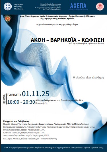 Με στόχο την ευαισθητοποίηση του κοινού, η Γενική Διεύθυνση Δημόσιας Υγείας και Κοινωνικής Μέριμνας της Περιφέρειας Κεντρικής Μακεδονίας με Αντιπεριφερειάρχη Υγείας & Κοινωνικής Αλληλεγγύης την κ. Μαρία (Μελίνα) Δερμεντζοπούλου, μαζί με την Διεύθυνση Δημόσιας Υγείας & Κοινωνικής Μέριμνας της Περιφερειακής Ενότητας Ημαθίας, με Αντιπεριφερειάρχη τον κ. Καλαϊτζίδη Κωνσταντίνο, και το Κέντρο Κοχλιακών Εμφυτεύσεων της A΄ Πανεπιστημιακής Ω.Ρ.Λ. Κλινικής Α.Π.Θ., του Γενικού Πανεπιστημιακού Νοσοκομείου Θεσσαλονίκης «ΑΧΕΠΑ», με Υπεύθυνο του Κέντρου τον Dr Κυριαφίνη Γεώργιο, διοργάνωσαν επιστημονική ημερίδα με θέμα: «Ακοή – βαρηκοΐα – κώφωση. Από την πρόληψη έως την αποκατάσταση», το Σάββατο 1 Νοεμβρίου 2025, από τις 18:00 έως 20:30, στην αίθουσα του Επιμελητηρίου Βέροιας – Κεντρικής 3, Βέροια Ημαθίας.