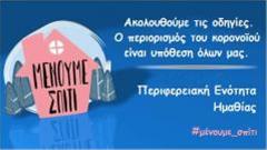 Η Περιφερειακή Ενότητα Ημαθίας εντείνει την προσπάθειά της, για την ενημέρωση των πολιτών και την εφαρμογή των έκτακτων μέτρων που ανακοινώθηκαν για τον περιορισμό της μετάδοσης του κορονοϊού. Μέσω μηνύματος καλεί τους πολίτες να παραμείνουν στα σπίτια τους ενώ ο Αντιπεριφερειάρχης Κώστας Καλαϊτζίδης μέσω νέου μηνύματος, στη σελίδα του στο facebook, σημειώνει: “Μένουμε σπίτι κι ακολουθούμε τις οδηγίες διότι ο περιορισμός της μετάδοσης του κορονοϊού είναι υπόθεση όλων μας. Αυτό είναι το μήνυμα που πρέπει να κοινοποιηθεί παντού και να τηρηθεί από όλους μας. Στο τέλος αυτής της κρίσης, πρέπει να είμαστε όλοι εδώ και να επανέλθουμε ακόμη πιο δυνατοί”.