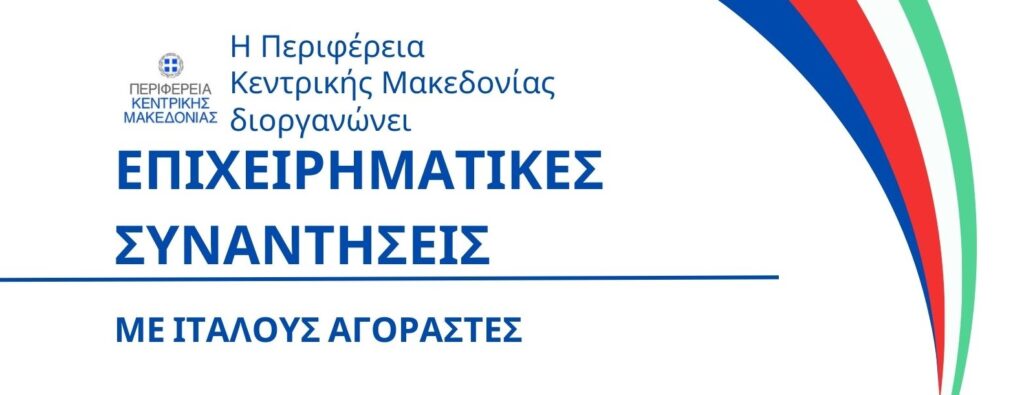 Η Περιφέρεια Κεντρικής Μακεδονίας και το Περιφερειακό Ταμείο Ανάπτυξης Κεντρικής Μακεδονίας, στο πλαίσιο της πολιτικής τους για την προβολή και προώθηση των προϊόντων της περιοχής, διοργανώνουν επιχειρηματική συνάντηση Ιταλών αγοραστών με επιχειρήσεις τροφίμων και ποτών της Περιφέρειας Κεντρικής Μακεδονίας, το διάστημα από τις 15 έως τις 19 Οκτωβρίου 2025, στη Θεσσαλονίκη.