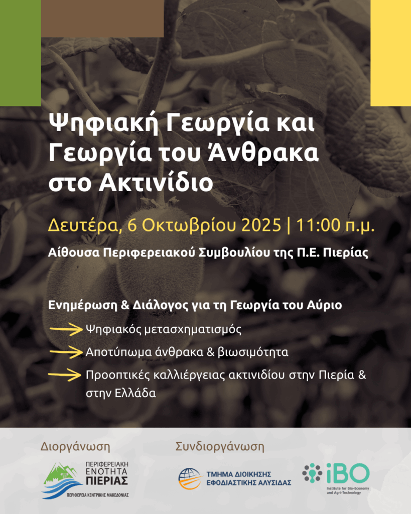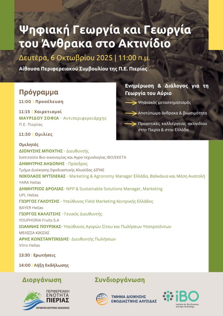 Με πρωτοβουλία της Αντιπεριφερειάρχη Πιερίας, Σοφίας Μαυρίδου, η Περιφερειακή Ενότητα Πιερίας διοργανώνει τη Δευτέρα 6 Οκτωβρίου 2025 και ώρα 11:00 π.μ., στην Αίθουσα Περιφερειακού Συμβουλίου της Π.Ε. Πιερίας στην Κατερίνη, την εκδήλωση με τίτλο «Ψηφιακή Γεωργία και Γεωργία του Άνθρακα στο Ακτινίδιο». Η εκδήλωση πραγματοποιείται σε συνεργασία με το Ινστιτούτο Βιο-Οικονομίας και Αγρο-Τεχνολογίας (iBO) του Εθνικού Κέντρου Έρευνας και Τεχνολογικής Ανάπτυξης (ΕΚΕΤΑ) και το Τμήμα Διοίκησης Εφοδιαστικής Αλυσίδας του Διεθνούς Πανεπιστημίου Ελλάδος, με τη συμμετοχή εκπροσώπων της επιστημονικής κοινότητας, του αγροδιατροφικού κλάδου και της τοπικής αυτοδιοίκησης.