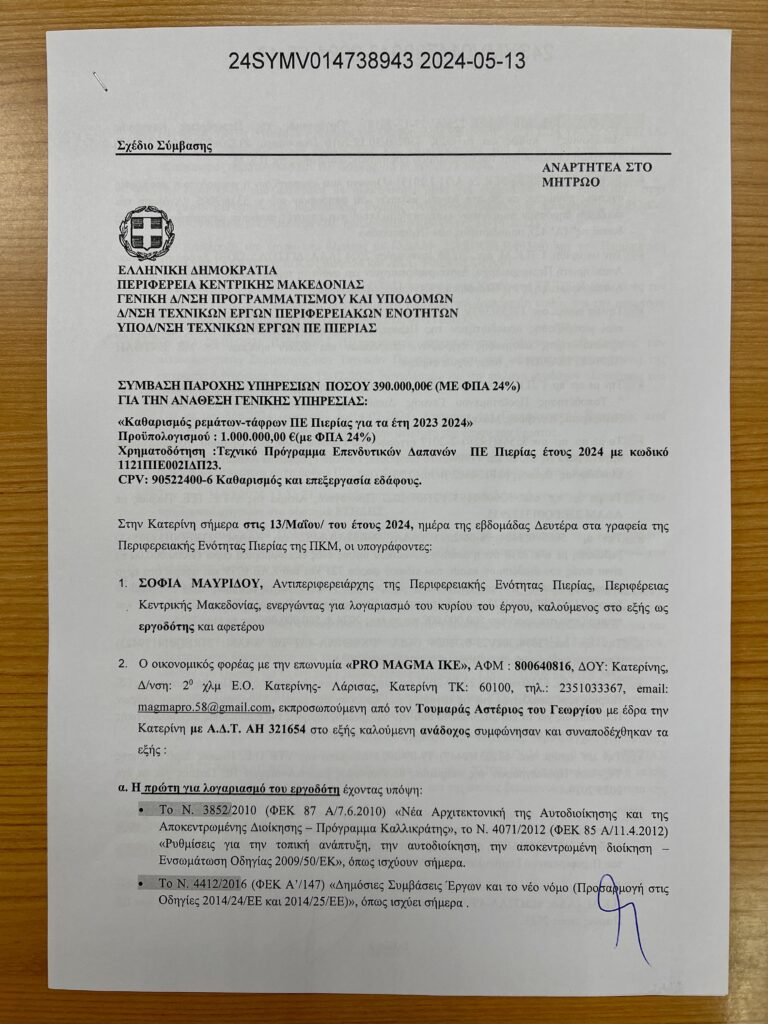 Τη Δευτέρα, 13 Μαΐου 2024, υπεγράφη η σύμβαση μεταξύ της Περιφερειακής Ενότητας Πιερίας και του αναδόχου μετά από ανοιχτό διαγωνισμό, για την υλοποίηση του έργου με τίτλο “Καθαρισμός ρεμάτων – τάφρων ΠΕ Πιερίας για τα έτη 2023-2024”. Το εν λόγω έργο με κωδικό 1121ΠΙΕ002ΙΔΠ23 χρηματοδοτείται από το Τεχνικό Πρόγραμμα Επενδυτικών Δαπανών ΠΕ Πιερίας και αφορά σε γενικές υπηρεσίες καθαρισμού και επεξεργασίας εδάφους.