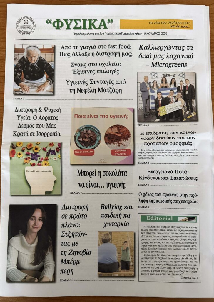 Την έναρξη ουσιαστικού διαλόγου που θα δώσει την ευκαιρία στους πολίτες να κατανοήσουν τα βασικά χαρακτηριστικά του υγιούς τρόπου ζωής, φιλοδοξεί να αποτελέσει, με άρθρα, συνεντεύξεις και έρευνες,  η περιοδική έκδοση του Ομίλου Δημοσιογραφίας του 2ου Πειραματικού Γυμνασίου Κιλκίς, υπό τον τίτλο «ΦΥΣΙΚΑ» (Ιανουάριος 2026), την οποία παρουσίασαν  και έδωσαν στον Αντιπεριφερειάρχη Ανδρέα Βεργίδη, δύο μαθήτριες – μέλη του Ομίλου, συνοδευόμενες από τον καθηγητή και ενός εκ των υπευθύνων του Ομίλου, Κωνσταντίνο Ντίνου.
