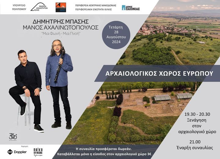 Η Εφορεία Αρχαιοτήτων Κιλκίς με την στήριξη του Υπουργείου Πολιτισμού της Περιφερειακής Ενότητας Κιλκίς, του Δήμου Παιονίας, της Περιφέρειας Κεντρικής Μακεδονίας και του Κέντρου Πολιτισμού Περιφέρειας Κεντρικής Μακεδονίας σας προσκαλούν σε μια συναυλία-εμπειρία για την ανάδειξη του Αρχαιολογικού Χώρου Ευρωπού (στην κοιλάδα του Αξιού), την Τετάρτη 28 Αυγούστου 2024, «Μία Φωνή – Μία Πνοή» με τους αγαπημένους καλλιτέχνες, Δημήτρη Μπάση και Μάνο Αχαλινωτόπουλο.