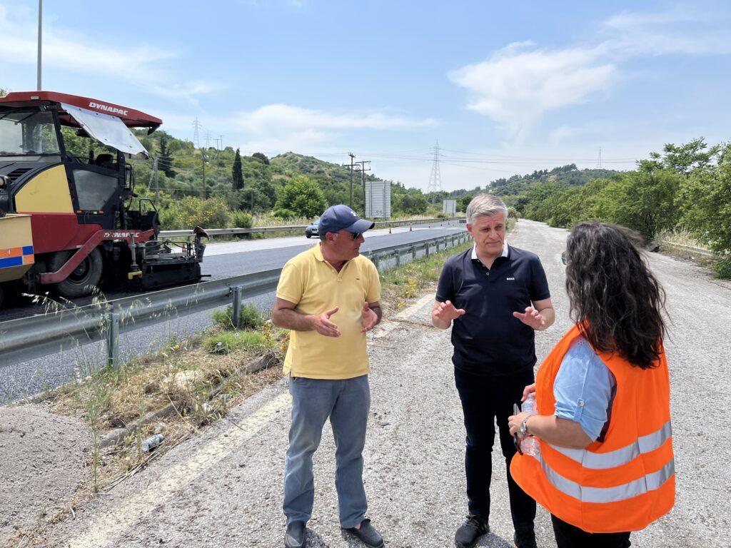 Ο Αντιπεριφερειάρχης Θεσσαλονίκης, Κ. Γιουτίκας, ενημερώθηκε επί τόπου, από τους επιβλέποντες μηχανικούς της Υποδιεύθυνσης Τεχνικών Έργων της Μ.Ε. Θεσσαλονίκης, ότι ήδη έχουν ολοκληρωθεί οι εργασίες ασφαλτόστρωσης και διαγράμμισης στο τμήμα της παλαιάς ε.ο. από το ύψος του Δερβενίου (έξοδος από Εγνατία) έως τη διασταύρωση με την ε.ο. Θεσσαλονίκης – Σερρών, καθώς και στον κόμβο των Λαγυνών.
